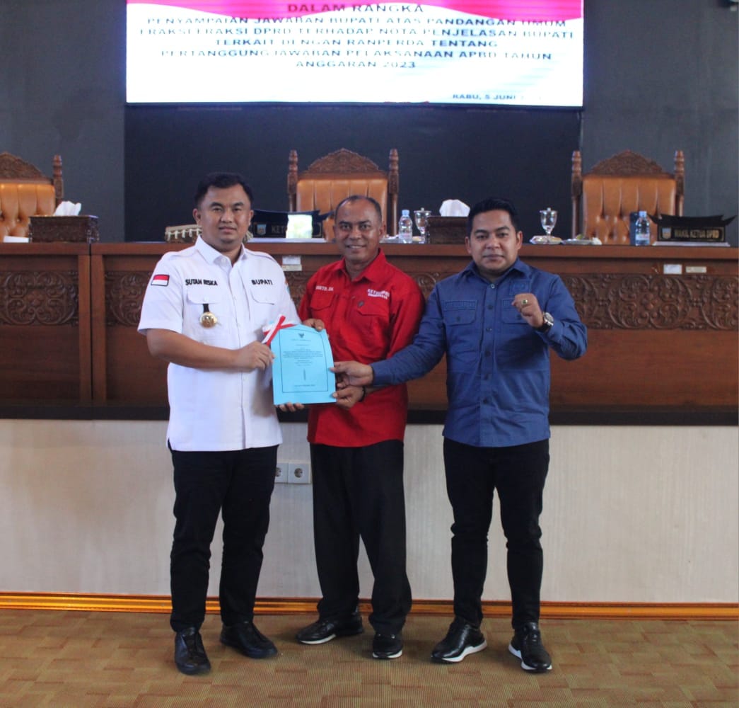 Bupati Berikan Jawaban Atas Pandangan Umum DPRD Terhadap Ranperda Pertanggungjawaban Pelaksanaan APBD 2023DHARMASRAYA – Bupati Dharmasraya, Sutan Riska Tuanku Kerajaan menghadiri sekaligus menjawab atas pandangan umum yang disampaikan oleh anggota Dewan Perwakilan Rakyat Daerah (DPRD). Terhadap Ra...