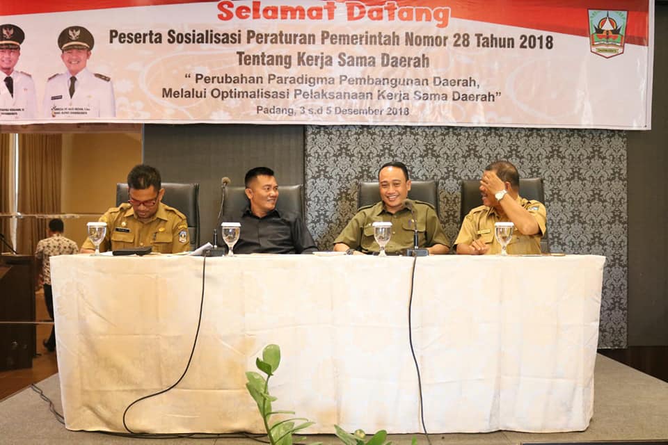 DHARMASRAYA - Pemerintah Kabupaten Dharmasraya menggelar Sosialisasi Peraturan Pemerintah Nomor 28 Tahun 2018 tentang Kerja Sama Daerah dan Penyusunan Road Map Kerja Sama Daerah, di Hotel HW Padang, Selasa (04/12). Acara yang menghadirkan narasumber dari Kementerian Dalam Negeri tersebut dibuka seca...