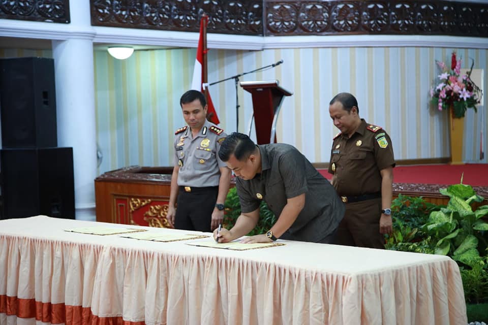 PADANG - Bupati Dharmasraya, Sutan Riska Tuanku Kerajaan, melakukan penandatanganan perjanjian kerjasama dengan Aparat Pengawasan Internal Pemerintah (APIP) dan Aparat Penegak Hukum/APH (Kajari dan Kapolres), di Aula Kantor Gubernur Sumatera Barat, Selasa (27/11).Penandatanganan perjan...