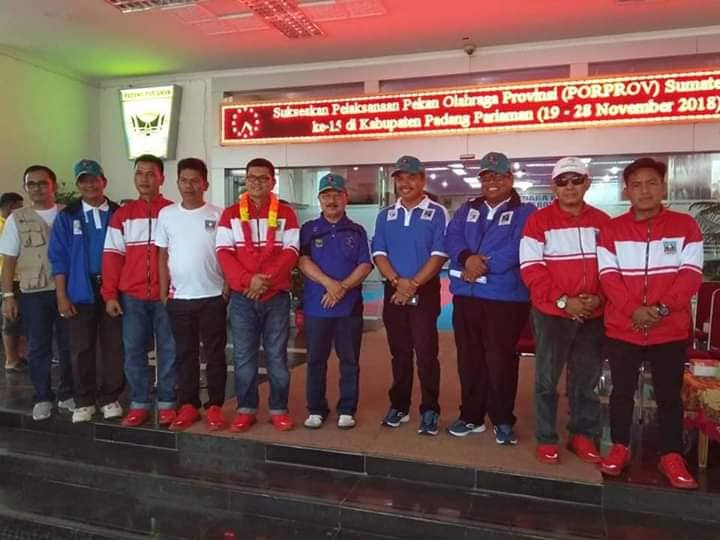 Padang Pariaman - Kontingen Kabupaten Dharmasraya disambut oleh Bupati Padang Pariaman, H Ali Mukni, Minggu (18/11) di Halaman kantor Bupati Padang Pariaman. Pada Acara Penyambutan ini KONIDharmasraya yang diwakili Oleh Ketua harian KONI Dharmasraya H Eri Antoni.Bupati Padan...