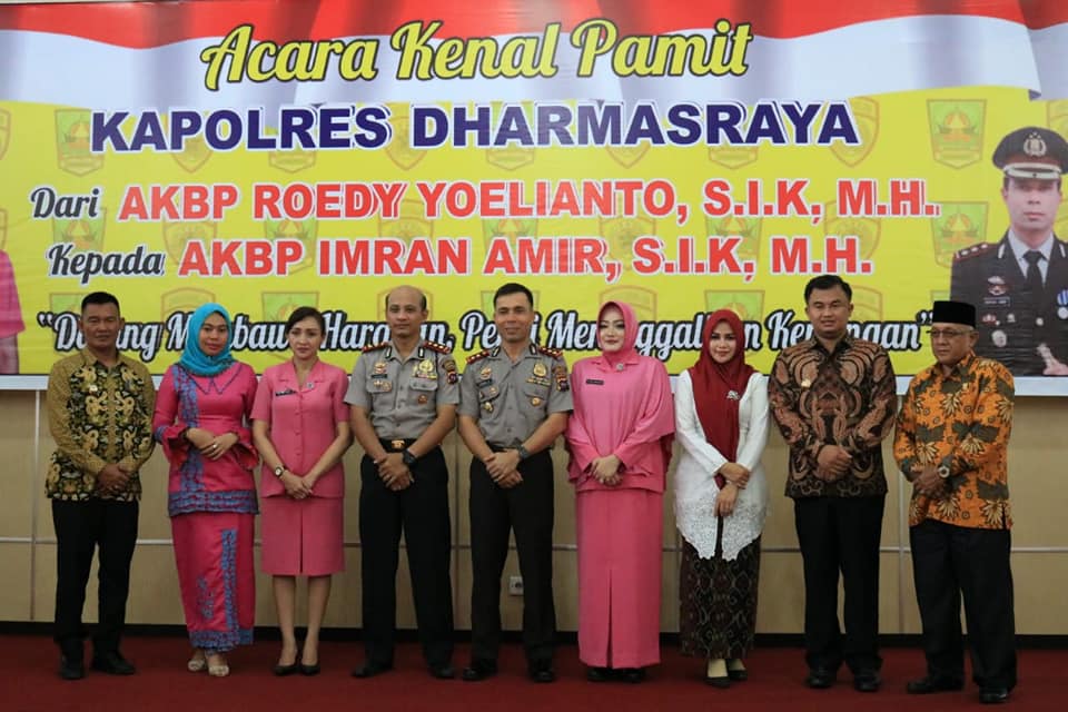 DHARMASRAYA - Acara kenal pamit Kapolres Dharmasaya dari pejabat lama AKBP Roedy Yoelianto, S.I.K, M.H kepada pejabat baru, AKBP Imran Amir, S.I.K, M.H, dilaksanakan di Auditorium Dharmasraya, Kamis (08/11).Hadir dalam acara tersebut Bupati Dharmasraya, Sutan Riska Tuanku Kerajaan beserta istri, Wak...