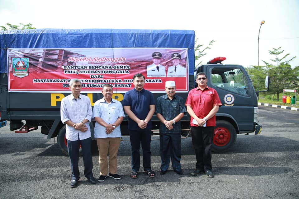 Dharmasraya - Bupati Dharmasraya Sutan Riska Tuanku Kerajaan, Ahad (4/11), melepas bantuan ke Palu, Donggala dan Sigi.Hadir dalam pelepasan bantuan Sekda Dharmasraya Adlisman, Asisten III M Yusuf, Staf ahli Martoni dan Kabag Humas pemkab Dharmasraya Arwinta.Bupati Dharmasraya, Sutan Riska Tuanku Ker...