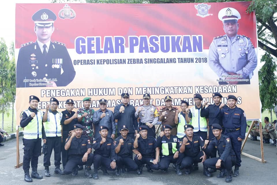 DHARMASRAYA - Polres Dharmasraya melaksanakan Apel Gelar Pasukan Operasi Zebra Singgalang Tahun 2018 di Halaman Kantor Bupati Dharmasraya, Selasa (30/10). Apel gelar pasukan yang turut dihadiri oleh Bupati Dharmasraya, Sutan Riska Tuanku Kerajaan, Forkopimda dan OPD tersebut dipimpin langsung oleh K...