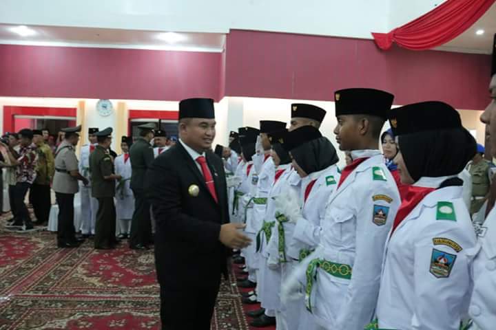 DHARMASRAYA - Bupati Dharmasraya, Sutan Riska Tuanku Kerajaan, mengukuhkan 74 Pasukan Pengibar Bendera Pusaka (Paskibraka) Kabupaten Dharmasraya Tahun 2018 di Auditorium Dharmasraya, Rabu (15/08) malam. 74 orang Paskibraka ini akan mengemban tugas mengibarkan Sang Saka Merah Putih dalam upacara peri...