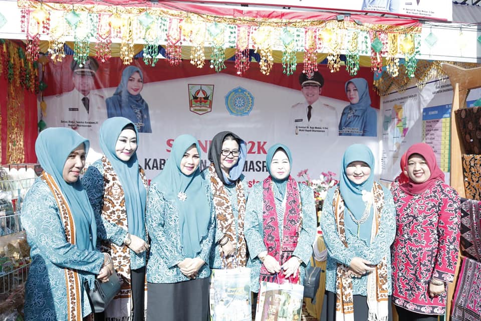 Ketua TP PKK Kabupaten Dharmasraya, Ny. Dewi Sutan Riska, saat mendampingi Ketua Umum TP PKK Pusat, dr. Erni Tjahjo Kumolo, ketika mengunjungi Stand Pameran UP2K Kabupaten Dharmasraya dalam acara pembukaan Jambore Kader PKK Berprestasi, Gelar Teknologi Tepat Guna (TTG) dan Jambore IMP-PLKB Tingkat P...