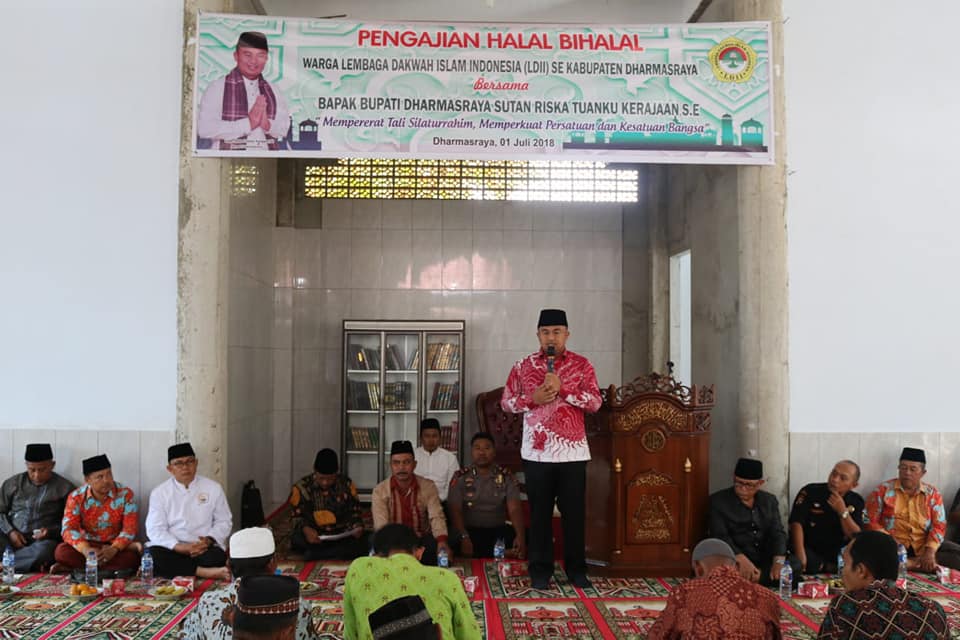 DHARMASRAYA - Bupati Dharmasraya, Sutan Riska Tuanku Kerajaan, memenuhi undangan Pengajian Halal Bihalal yang diselenggarakan oleh DPD Lembaga Dakwah Islam Indonesia (LDII) Kabupaten Dharmasraya, di Masjid Al Manshurin Koto Agung, Nagari Sungai Duo, Kecamatan Sitiung, Ahad (01/07).Pada kesempatan it...