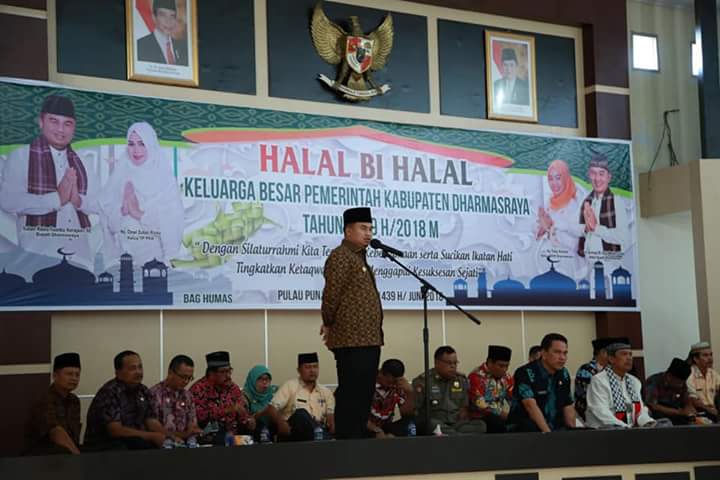 DHARMASRAYA - Pemerintah Kabupaten Dharmasraya menggelar halal bihalal bersama seluruh ASN di Auditorium Dharmasraya, Kamis (21/06). Halal bihalal yang dihadiri langsung oleh Bupati Sutan Riska Tuanku Kerajaan ini adalah dalam rangka memperkuat silaturahmi antar jajaran ASN di lingkup Pemerintah Kab...