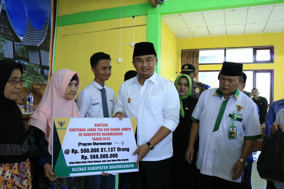 DHARMASRAYA - Badan Amil Zakat Nasional (Baznas) Kabupaten Dharmasraya salurkan zakat untuk janda tua, orang jompo kurang mampu serta beasiswa bagi siswa SD, SMPAI dan SMA se derajat se Kecamatan Pulau Punjung. Penyerahan zakat ini dilakukan oleh Bupati Dharmasraya, Sutan Riska Tuanku Kerajaan, dida...