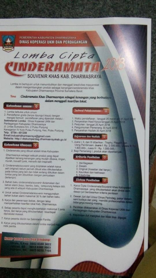 Assalamu’alaykum, dunsanak.. Guna menumbuhkan dan menggali kreativitas masyarakat dalam mengembangkan produk sebagai kenang-kenangan/cinderamata khas Kabupaten Dharmasraya, Pemerintah Kabupaten Dharmasraya melalui Dinas Koperasi, UKM dan Perdagangan (Diskumperdag) menggelar Lomba Cipt...