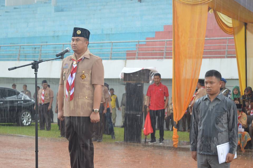 Humas Pemkab Dharmasraya - Bupati Dharmasraya Sutan Riska Tuanku Kerajaan mengaku bahagia dan terharu dengan semangat dari para peserta saat mengikuti upacara HUT Gerakan Pramuka ke 56 di Sport Center Kabupaten Dharmasraya, Senin (14/8) siang. Meski diguyur hujan yang lebat, para Praja Muda Karana d...