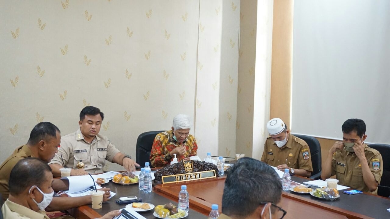 Bupati Dharmasraya, Sutan Riska Tuanku Kerajaan, dan Wakil Bupati Dharmasraya, Dasril Panin, Dt. Labuan, mendengarkan ekpos Sekda, H. Adlisman, tentang rancangan SOTK di Ruang Rapat Bupati Dharmasraya, Senin (08/03/21). Hadir juga Asisten, Kepala Perangkat Daerah dan Kepala Bagian terkait. ...